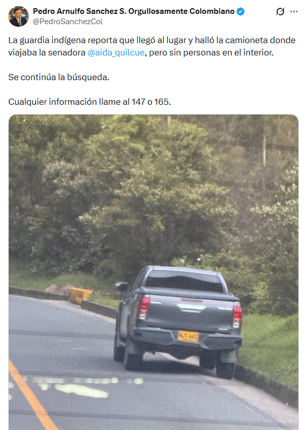 Minutos más tarde Sánchez, compartió un nuevo trino informando que la guardia indígena habrían encontrado la camioneta donde viajaba la senadora, pero sin personas en el interior. Hasta el momento, las autoridades no han confirmado contacto con los presuntos responsables ni entregado detalles sobre exigencias o comunicaciones posteriores.