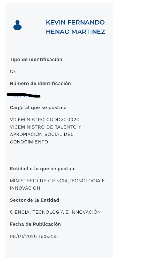 El Gobierno nacional avanzó sin mayores obstáculos administrativos en la formalización del nombramiento de Kevin Fernando Henao Martínez como viceministro de Talento y Apropiación Social del Conocimiento del Ministerio de Ciencia, tras la publicación de su hoja de vida por parte de la Presidencia de la República.