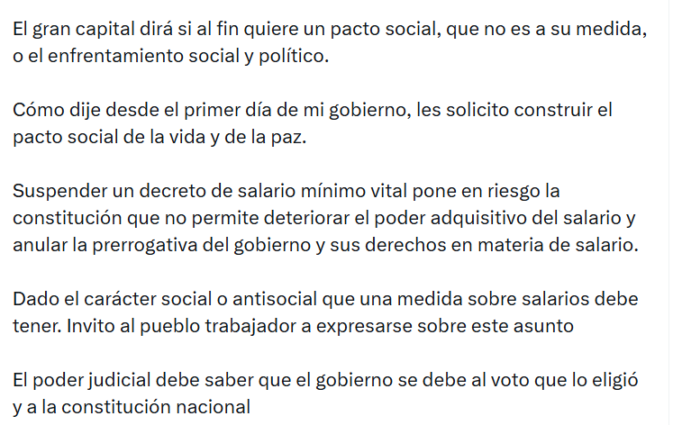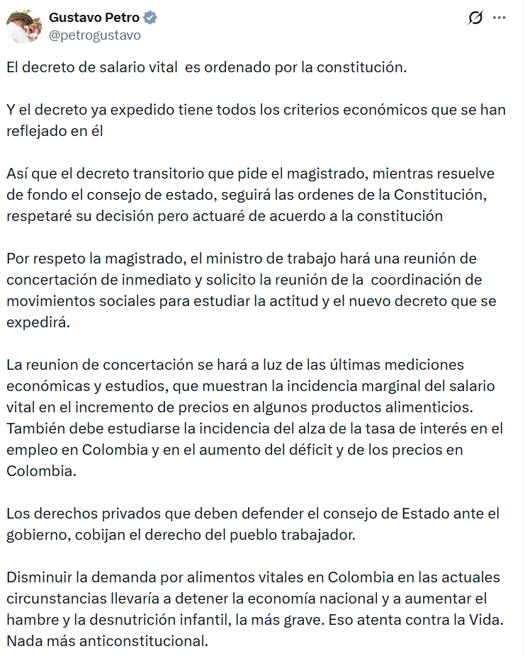 En las últimas horas también se pronunció el presidente Gustavo Petro, quien defendió la legalidad del decreto y afirmó que la figura del salario vital tiene respaldo constitucional. El mandatario manifestó que el acto administrativo expedido incluyó criterios económicos que, según su explicación, cumplen los parámetros exigidos por la normativa.