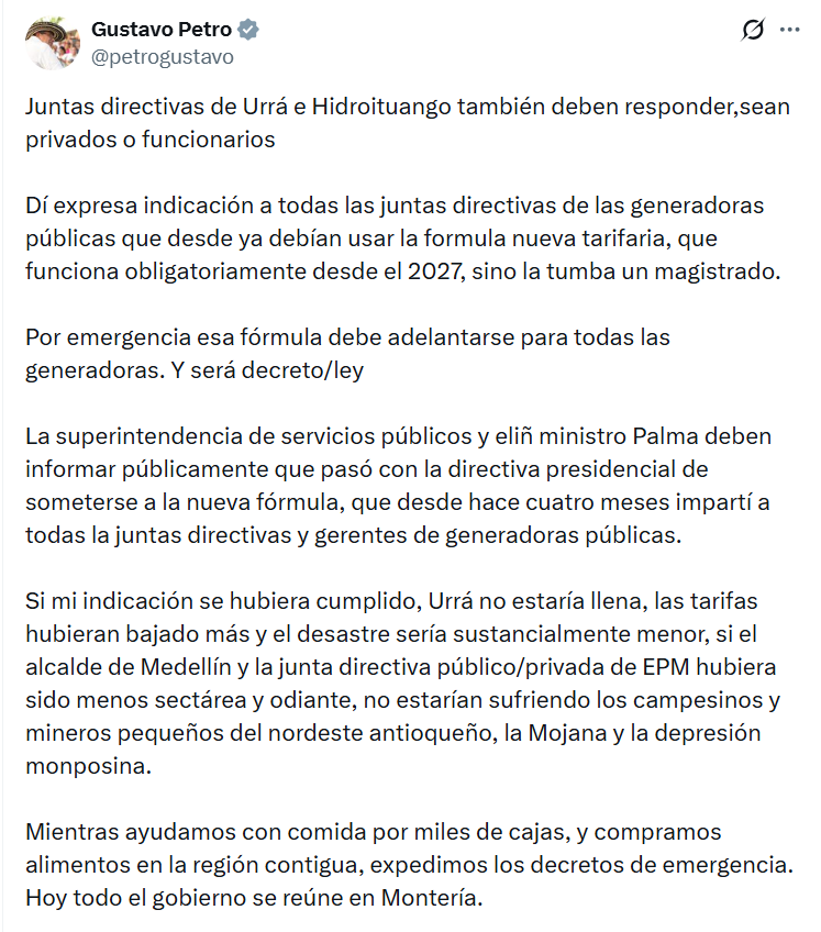 En un nuevo pronunciamiento, señaló directamente a las juntas directivas de Urrá e Hidroituango y afirmó que deben responder, sean privadas o públicas. Indicó que había impartido instrucciones para aplicar de manera anticipada una fórmula tarifaria prevista obligatoriamente desde 2027 y anunció que su implementación por emergencia se hará mediante decreto con fuerza de ley.