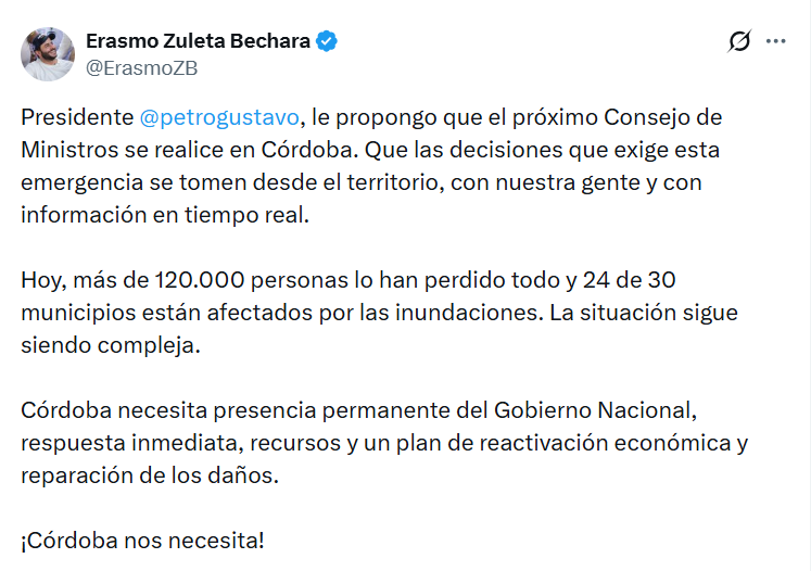 Petro estaría respondiendo al llamado del gobernador de Córdoba, Erasmo Zuleta Bechara, quien habría solicitado al jefe de Estado que el Consejo de Ministros se realizara en el departamento para adoptar medidas desde el territorio. De acuerdo con el mandatario regional, más de 120.000 personas han resultado damnificadas y 24 de los 30 municipios presentan afectaciones por inundaciones.