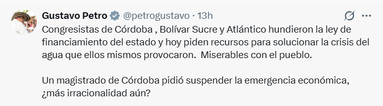 A través de la misma red social, el Presidente habría cuestionado a congresistas de Córdoba, Bolívar, Sucre y Atlántico por la no aprobación de la ley de financiamiento. En sus mensajes, vinculó la disponibilidad de recursos para la atención de la crisis con decisiones fiscales adoptadas en el Congreso. También se dirigió al magistrado Camargo Assis para solicitar apoyo en relación con la suspensión de la emergencia económica en la Corte Constitucional.