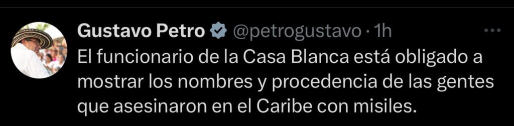 Ante la solicitud de Estados Unidos, el presidente Petro exigió que se revelen las identidades de las personas que habrían muerto en ataques con misiles de Estados Unidos. A través de la red social X, el mandatario dijo: “Que la Casa Blanca nos de la información de las personas que han muerto por misiles de los EE.UU, para saber si mi información es infundada”, “El funcionario de la Casa Blanca está obligado a mostrar los nombres y procedencia de las gentes que asesinaron en el Caribe con misiles” también publicó el mandatario recientemente en la red social.