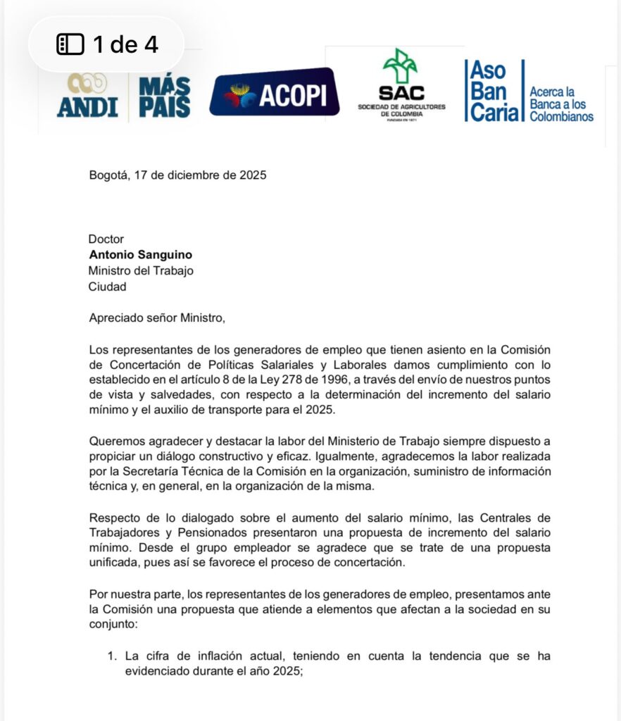 Los principales gremios empresariales del país fijaron oficialmente su posición frente al incremento del salario mínimo para 2025. La Asociación Nacional de Empresarios de Colombia, Andi; La Asociación Bancaria de Colombia, Asobancaria; la Sociedad de Agricultores de Colombia, SAC; y la Asociación Colombiana de Micro, Pequeñas y Medias Empresas, Acopi; enviaron una carta conjunta al ministro de Trabajo, Antonio Sanguino, en la que exponen sus consideraciones técnicas y formulan una propuesta concreta de aumento del 7,21%.