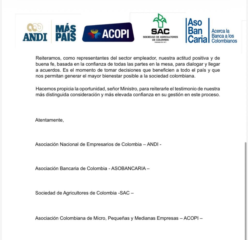 La comunicación se produce en el inicio de la fase posterior al cierre de las negociaciones directas, que concluyeron la semana anterior sin acuerdo. Con esta posición, los gremios empresariales dejan clara su propuesta, a la espera de que otros actores, como Fenalco, se pronuncien.
