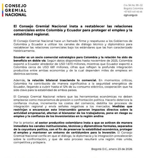El Consejo Gremial Nacional solicitó a los gobiernos de Colombia y Ecuador restablecer las relaciones comerciales entre ambos países, con el fin de proteger el empleo y la estabilidad en la región andina.