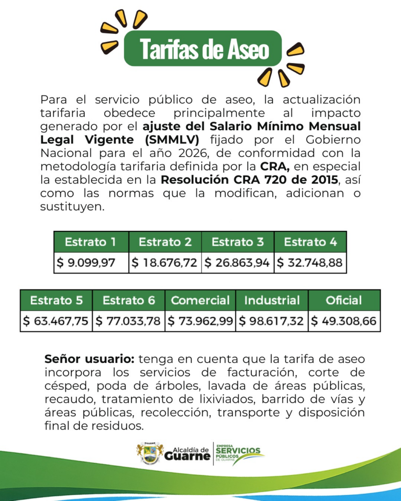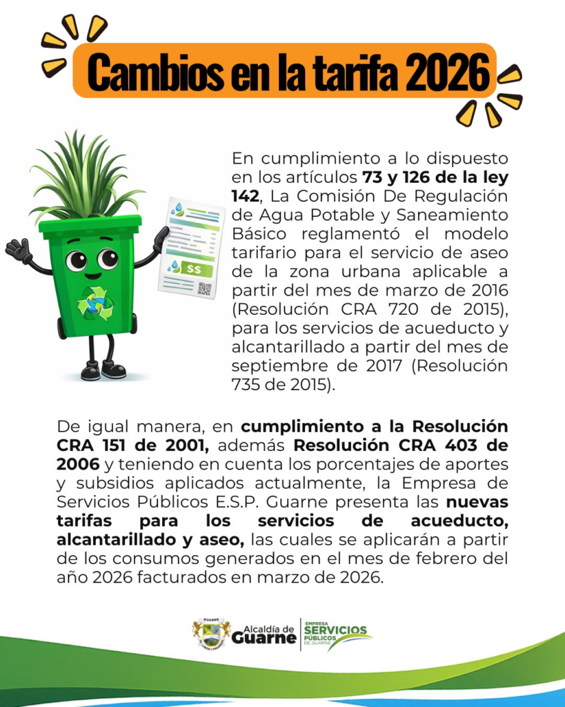 La Empresa de Servicios Públicos de Guarne anunció la entrada en vigor de una actualización en las tarifas de los servicios de acueducto, alcantarillado y aseo que comenzará a aplicarse con la facturación correspondiente a marzo de 2026. La medida responde a la normativa vigente en materia de servicios públicos domiciliarios y a la metodología tarifaria establecida por la Comisión de Regulación de Agua Potable y Saneamiento Básico.