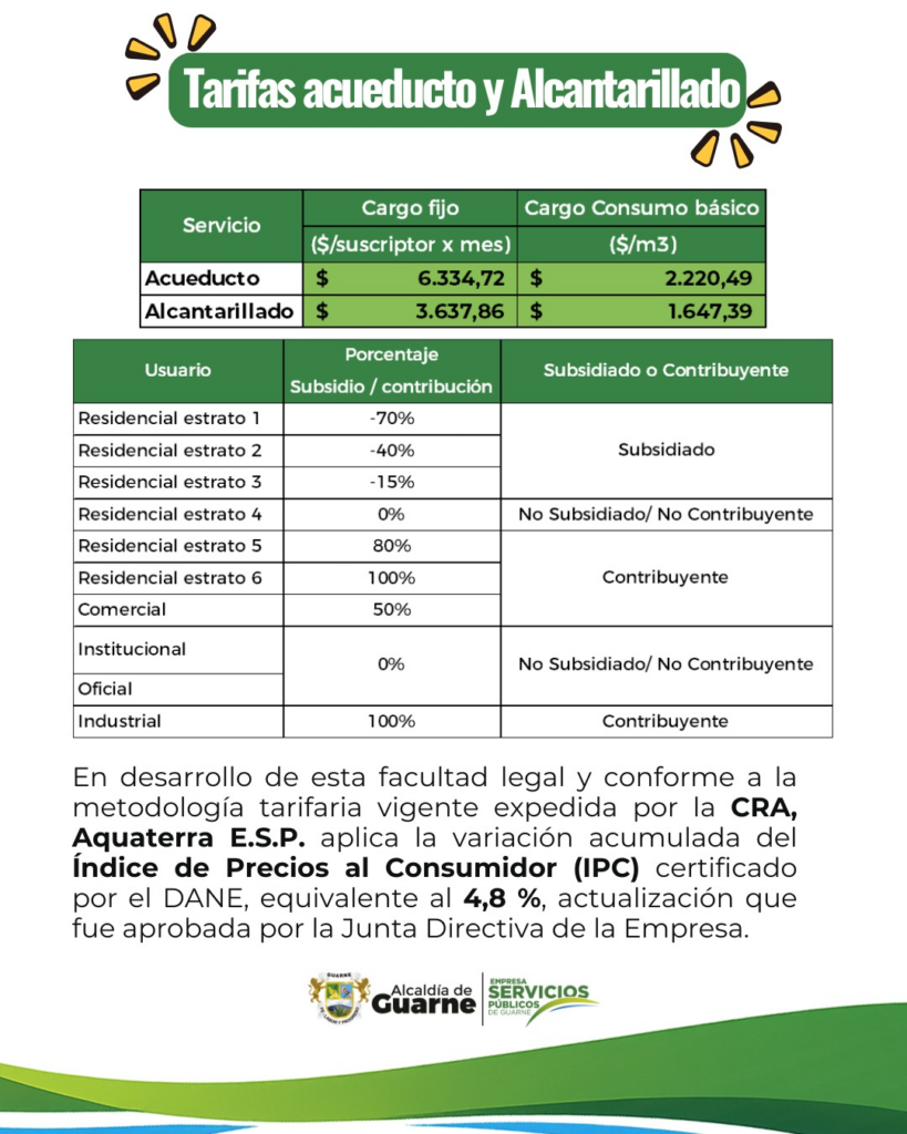 La variación tarifaria para acueducto y alcantarillado incluye la aplicación del Índice de Precios al Consumidor certificado por el Departamento Administrativo Nacional de Estadística, que reportó una variación acumulada del 4,8 %. Esta actualización fue aprobada por la junta directiva de la Aquaterra E.S.P., en cumplimiento de la regulación vigente.