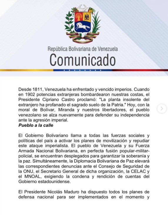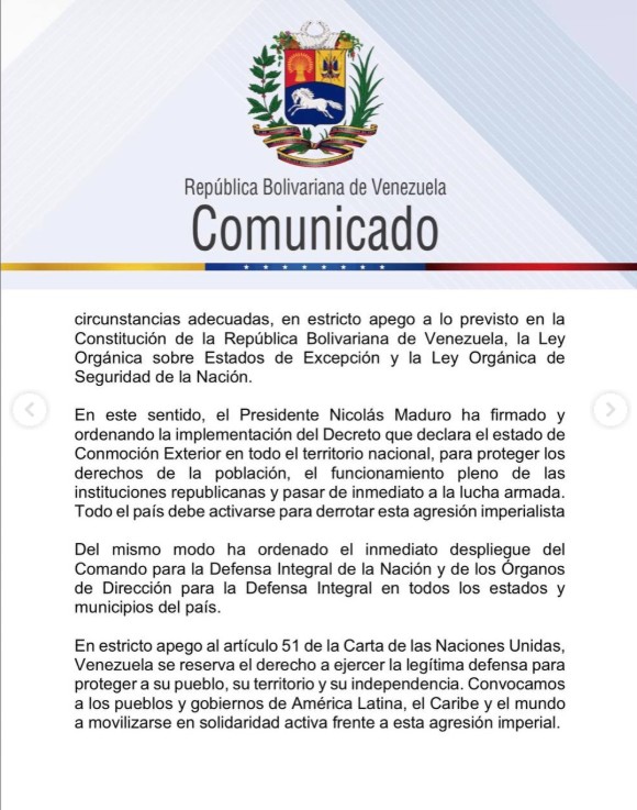 En el mensaje Maduro Guerra, rechazó la actuación de Estados Unidos y anunció medidas excepcionales en el país. En el documento se informó que Maduro firmó un decreto que declara el estado de conmoción exterior en todo el territorio nacional, con base en la Constitución, la Ley Orgánica sobre Estados de Excepción y la Ley Orgánica de Seguridad de la Nación.