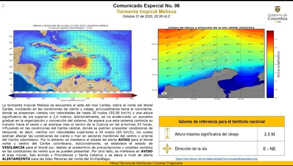 El Instituto de Hidrología, Meteorología y Estudios Ambientales de Colombia (Ideam) el Comunicado Especial No. 06 sobre la Tormenta Tropical Melissa, que se ubica en el oriente del mar Caribe y continúa generando una influencia directa sobre el nororiente colombiano, especialmente en los departamentos de La Guajira y Magdalena.