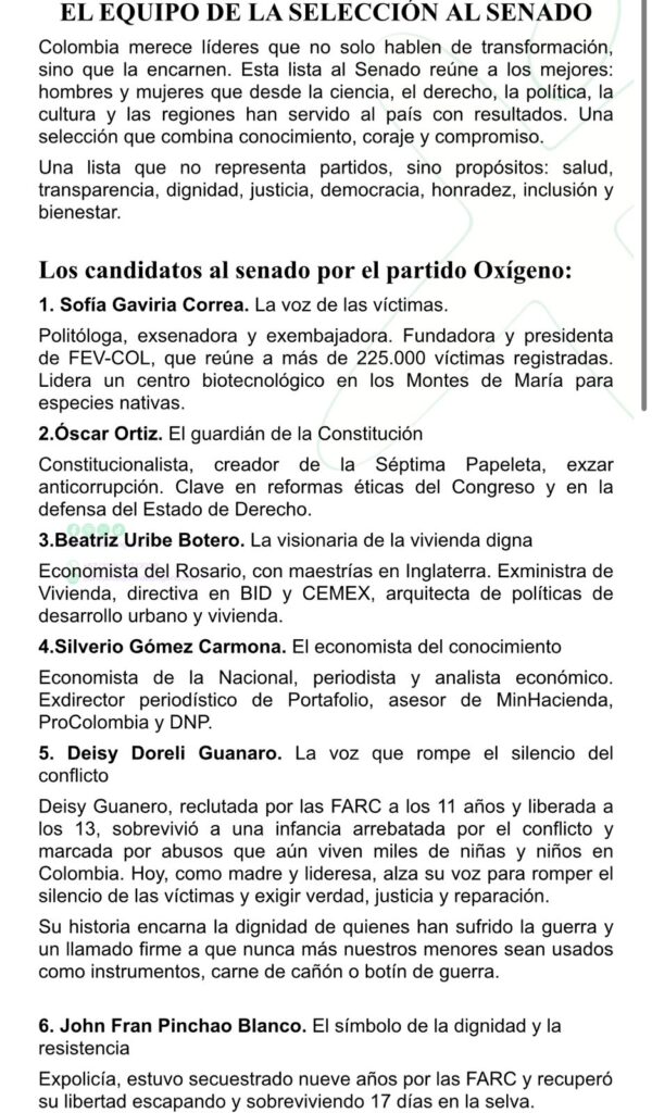 “Esta lista al Senado reúne a los mejores: hombres y mujeres que desde la ciencia, el derecho, la política, la cultura y las regiones han servido al país con resultados. Una selección que combina conocimiento, coraje y compromiso. Una lista que no representa partidos, sino propósitos: salud, transparencia, dignidad, justicia, democracia, honradez, inclusión y bienestar”, señaló el partido Oxígeno.