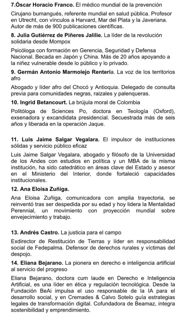 La lista completa fue revelada por Betancourt en su calidad de directora de Oxígeno, e incluye figuras provenientes de distintos sectores del país. Entre los primeros nombres está Sofía Gaviria Correa, exsenadora y expresidenta de FEV-COL; Óscar Ortiz, constitucionalista vinculado a reformas institucionales; Beatriz Uribe Botero, economista con trayectoria en vivienda y organismos multilaterales; Silverio Gómez Carmona, economista y periodista; y Deysi Doreli Guanaro, quien fue reclutada en su niñez por las FARC y hoy desarrolla trabajo con víctimas del conflicto.