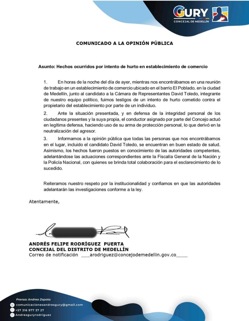 De acuerdo con la información entregada, los hechos ocurrieron mientras el concejal y su equipo político sostenían una reunión de trabajo en el lugar, en compañía del candidato a la Cámara de Representantes David Toledo. En ese momento, “fuimos testigos de un intento de hurto cometido contra el propietario del establecimiento por parte de un individuo”, señala el documento.
