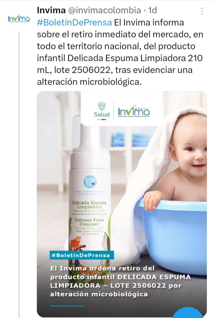El Instituto Nacional de Vigilancia de Medicamentos y Alimentos (Invima) dispuso el retiro inmediato en todo el país de un lote específico de la “Delicada Espuma Limpiadora 210 ml” dirigida a bebés y niños, luego de que análisis de laboratorio evidenciaran niveles de microorganismos por encima de los parámetros permitidos para este tipo de productos.