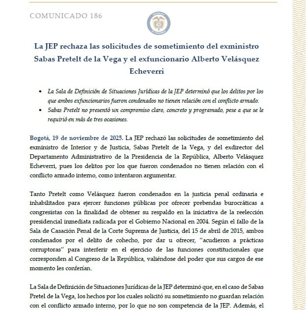 La Jurisdicción Especial para la Paz decidió no admitir las solicitudes de sometimiento del exministro del Interior y de Justicia, Sabas Pretelt de la Vega, y del exdirector del Departamento Administrativo de la Presidencia, Alberto Velásquez Echeverri, luego de concluir que las condenas impuestas a ambos por la justicia ordinaria no guardan relación con el conflicto armado interno.
