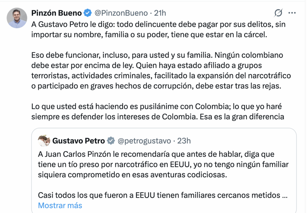 Las declaraciones de Pinzón se produjeron luego de que el presidente Petro hiciera referencia directa al exministro en una publicación en la que señaló que “a Juan Carlos Pinzón le recomendaría que antes de hablar, diga que tiene un tío preso por narcotráfico en EE. UU.”.