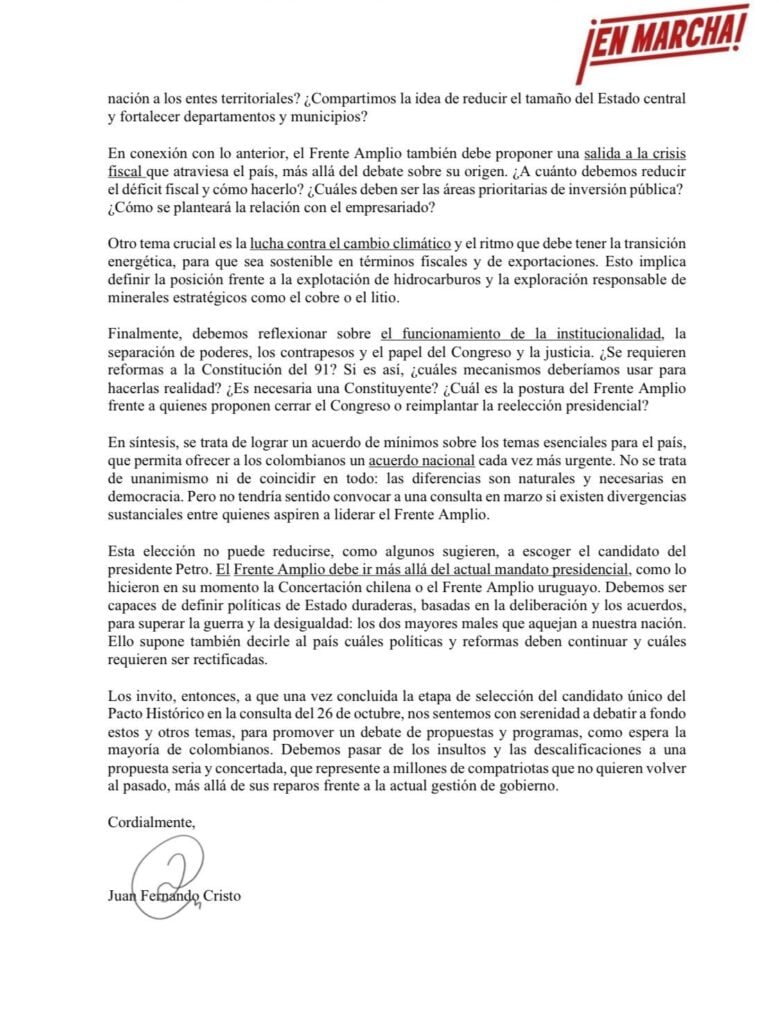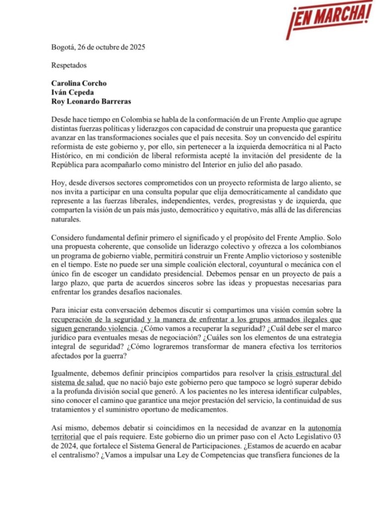 El exministro del Interior, Juan Fernando Cristo, envió una carta dirigida a Carolina Corcho, Iván Cepeda y Roy Barreras, en la que planteó la necesidad de construir un Frente Amplio que agrupara diversas fuerzas políticas y sociales, con el objetivo de “avanzar en las transformaciones sociales que el país necesita”.