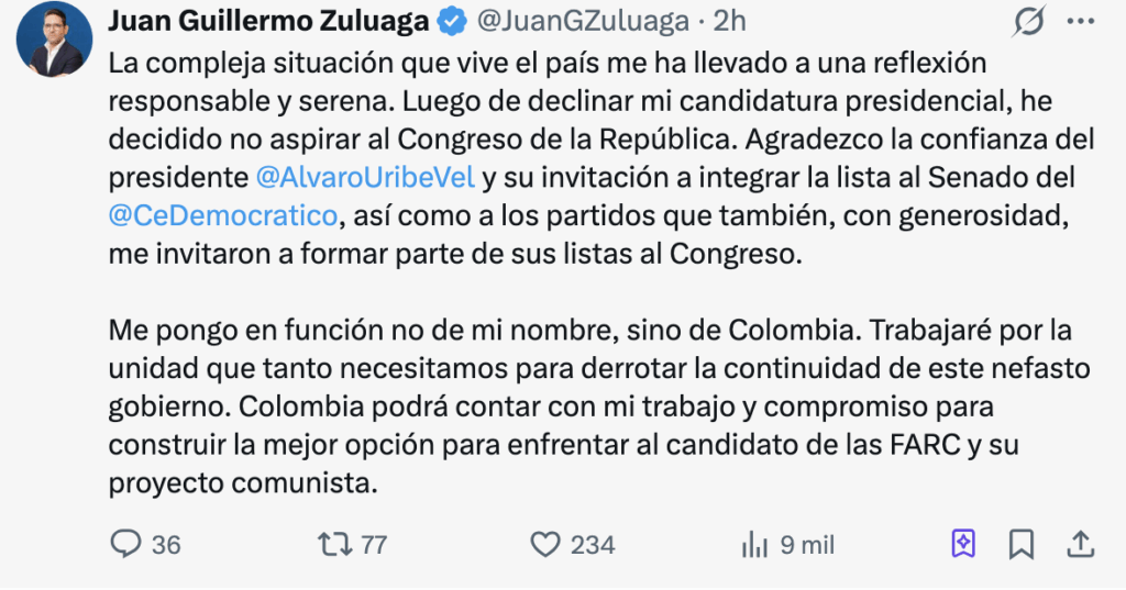 “La compleja situación que vive el país me ha llevado a una reflexión responsable y serena. Luego de declinar mi candidatura presidencial, he decidido no aspirar al Congreso de la República”, afirmó Zuluaga al abrir su mensaje, en el que señala que su decisión proviene de una evaluación del momento político nacional y de los desafíos que se presentan en el corto plazo.