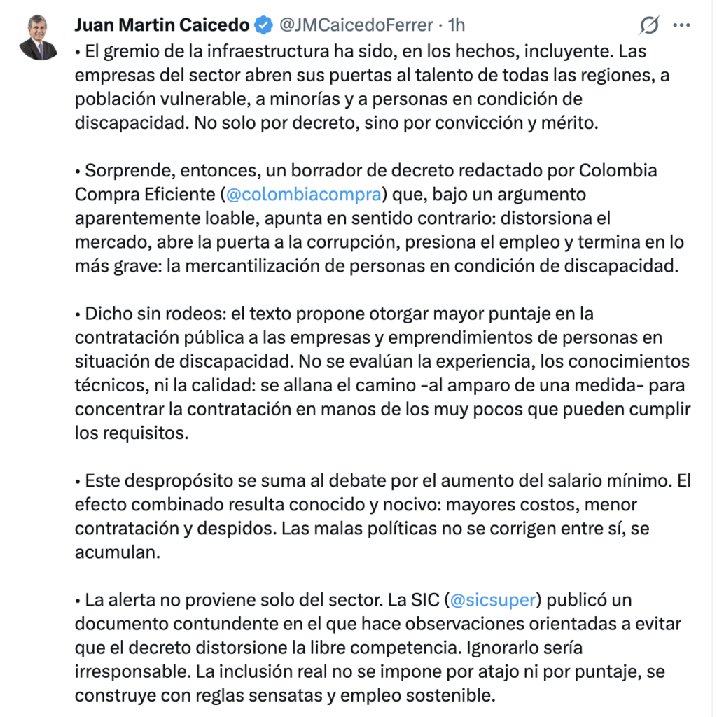 El presidente de la Cámara Colombiana de la Infraestructura, Juan Martín Caicedo, expresó su preocupación por un borrador de decreto elaborado por Colombia Compra Eficiente relacionado con los criterios de la contratación pública. El pronunciamiento fue hecho a través de un mensaje en el que el dirigente gremial cuestiona los efectos que, a su juicio, tendría la iniciativa sobre el mercado, el empleo y la libre competencia.