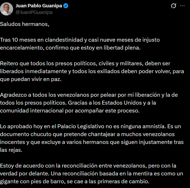 El dirigente opositor venezolano Juan Pablo Guanipa anunció que recuperó su libertad plena en la madrugada de este viernes, después de que la Asamblea Nacional aprobara una ley de amnistía dirigida a presos políticos detenidos entre 2002 y 2025.