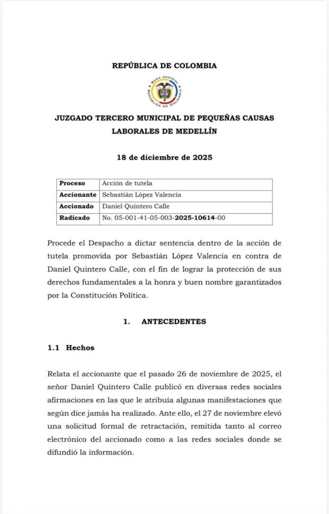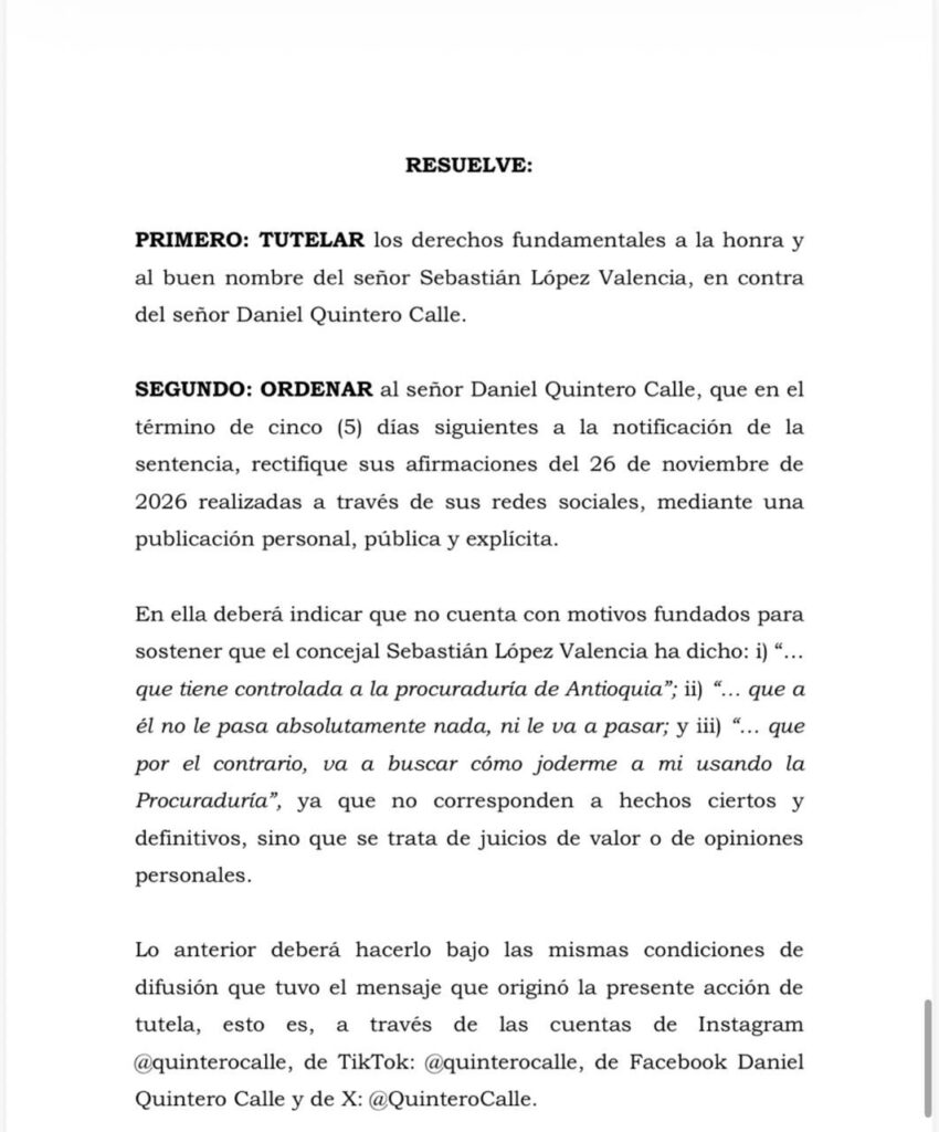 En su decisión, el juez determinó que las declaraciones difundidas en redes sociales excedieron los límites de la libertad de expresión y afectaron los derechos del accionante, razón por la cual resolvió amparar a Sebastián López. Como consecuencia del fallo, la autoridad judicial ordenó a Daniel Quintero retractarse públicamente de las afirmaciones realizadas.