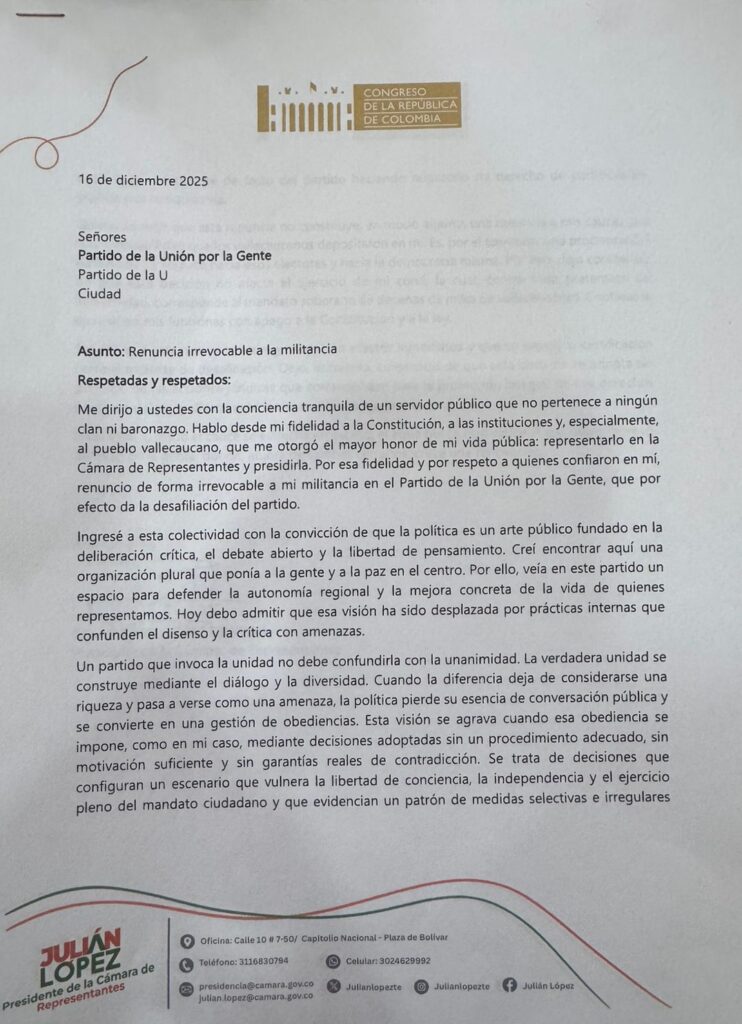 El presidente de la Cámara de Representantes, Julián David López Tenorio, presentó su renuncia irrevocable a la militancia del Partido de la Unión por la Gente (Partido de la U), decisión que oficializó mediante una carta dirigida a la colectividad y fechada el 16 de diciembre de 2025. Con este paso político, el dirigente vallecaucano deja abierta la puerta para buscar una aspiración a la Gobernación del Valle del Cauca.