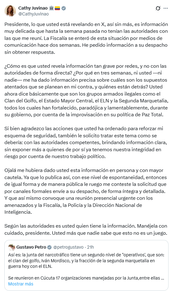 La congresista señaló que esa información no había sido conocida por las autoridades competentes y cuestionó que se divulgara públicamente. En su respuesta, expresó que había solicitado información oficial al despacho presidencial sin recibir respuesta. “Presidente, lo que usted está revelando en X es información muy delicada que hasta hace poco no tenían las autoridades”, indicó. También pidió que la información se maneje a través de los canales institucionales y no por redes sociales.