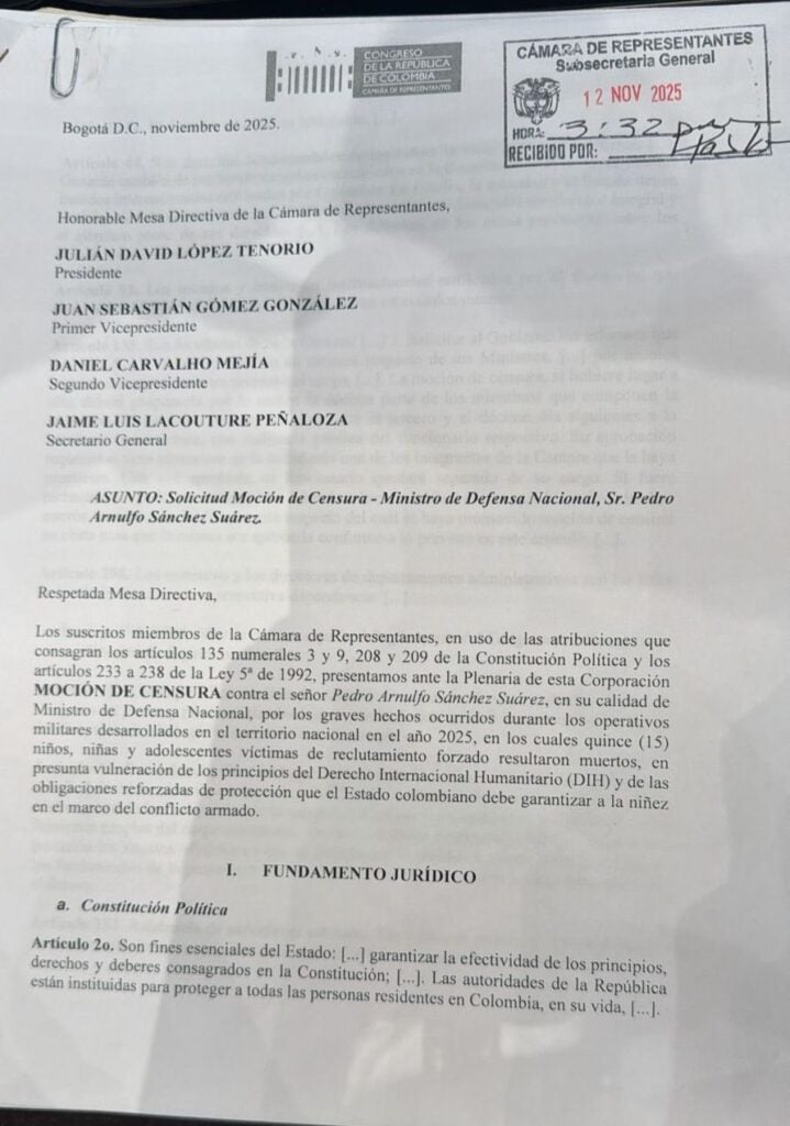En el documento, los firmantes sustentan que la moción se presenta “por los graves hechos ocurridos durante los operativos militares desarrollados en el territorio nacional en el año 2025, en los cuales quince (15) niños, niñas y adolescentes víctimas de reclutamiento forzado resultaron muertos”, señalando una presunta vulneración al Derecho Internacional Humanitario (DIH) y a las obligaciones reforzadas de protección que el Estado debe garantizar a la niñez en contextos de conflicto armado.