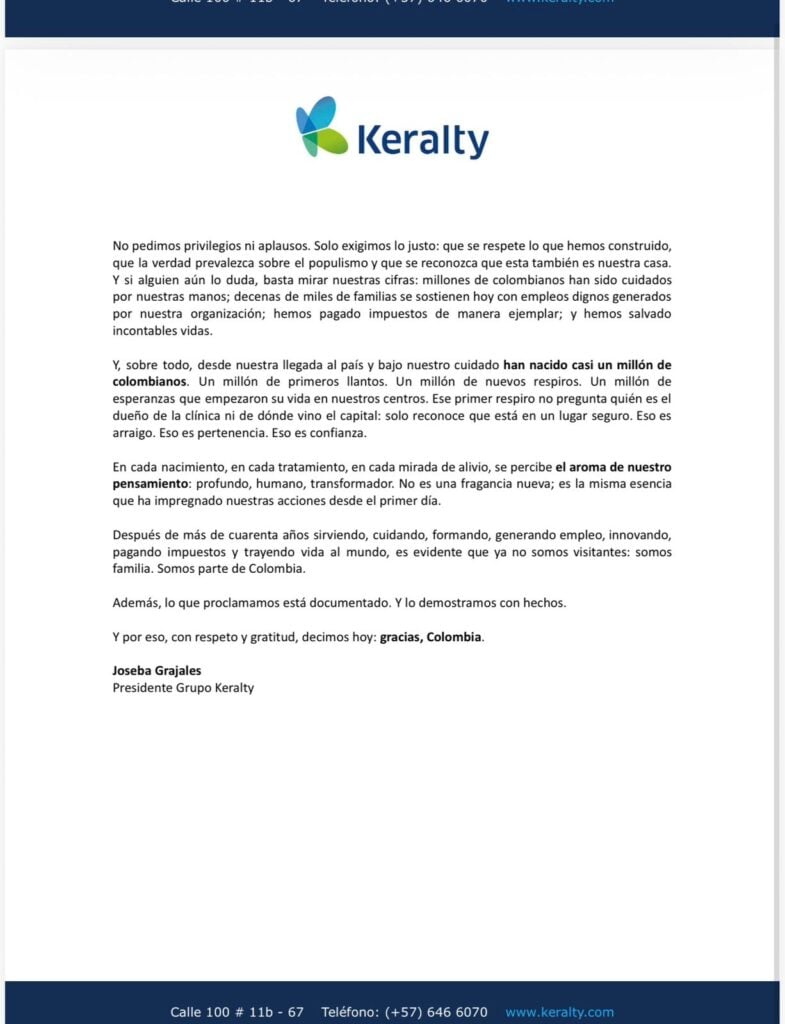 Grajales señaló que, pese a los señalamientos, Keralty ha mantenido una presencia continua en el territorio nacional. “Keralty llegó a Colombia hace más de cuarenta años, cuando la inmensa mayoría de los colombianos de hoy —incluidos los hijos y nietos de quienes nos critican— ni siquiera habían nacido”, indicó en su mensaje, en el que afirmó que la organización no llegó “de paso”, sino con la intención de “quedarse, servir, cuidar y construir”.