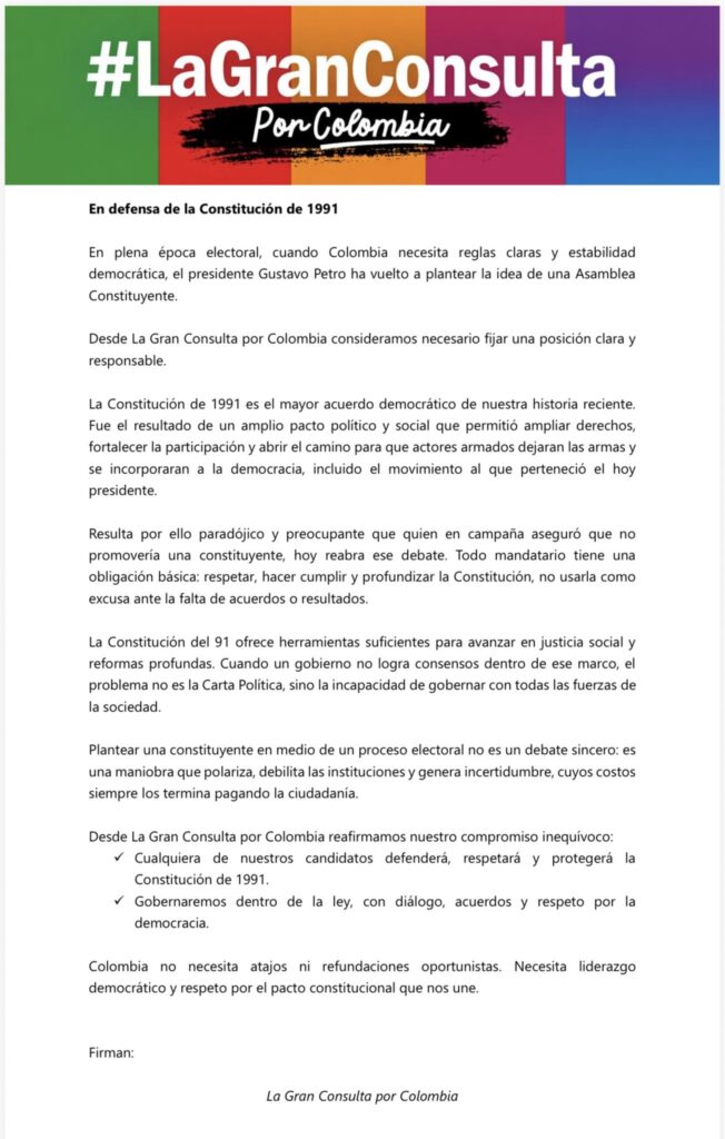 En medio del ambiente electoral y ante el reciente planteamiento del presidente Gustavo Petro sobre la posibilidad de convocar una Asamblea Constituyente, el movimiento La Gran Consulta por Colombia hizo público un pronunciamiento en el que fija su posición frente a este debate y reafirma su defensa de la Constitución de 1991.