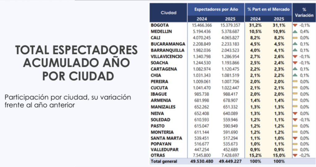 La industria cinematográfica en Colombia concluyó el año 2025 con un balance de estabilidad en número de espectadores y un crecimiento sostenido en ingresos, reflejando un mercado que, aunque enfrenta desafíos, mantiene su relevancia cultural y económica. Según el balance anual, las salas de cine registraron 49.449.227 asistentes, una leve disminución del 0,2% frente a 2024. No obstante, la taquilla total alcanzó aproximadamente 155,7 millones de dólares, lo que representa un crecimiento del 6,1%, impulsado principalmente por el aumento en el precio promedio de las entradas, la mayor demanda de formatos especiales y la apertura de complejos con tarifas más altas.