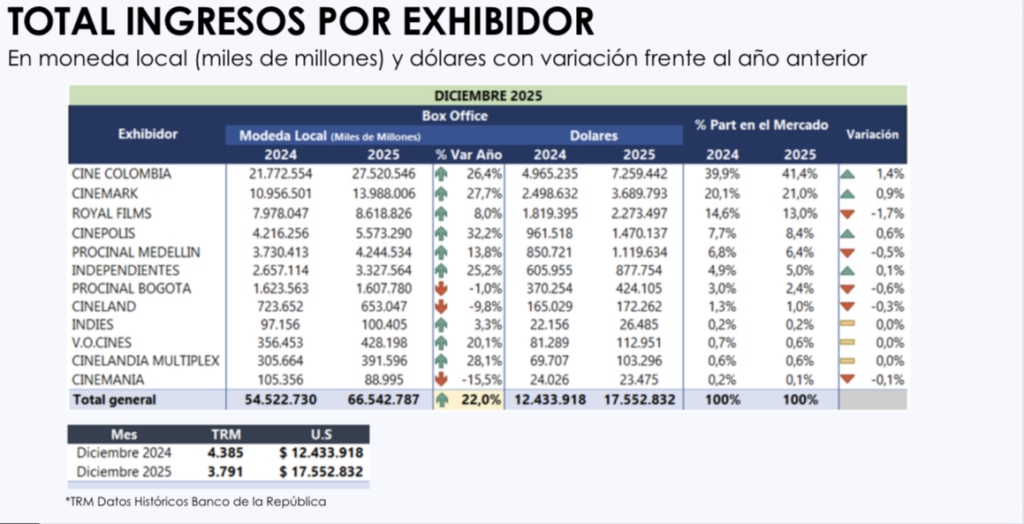 En cuanto a exhibidores, Cine Colombia lideró el mercado con el 39,8% de los espectadores y el 41,4% de la taquilla, seguido por Cinemark (21%), Royal (13%), Cinépolis (8,4%) y Cinepólix/Cineprox (6,4%). Bogotá se mantuvo como la principal plaza, concentrando el 31,1% de la asistencia nacional.