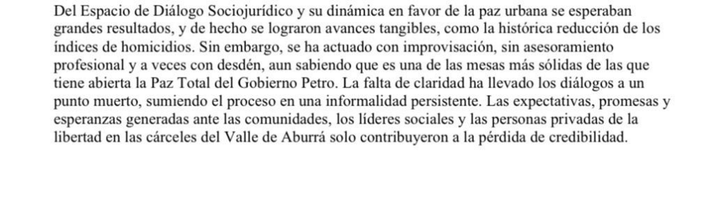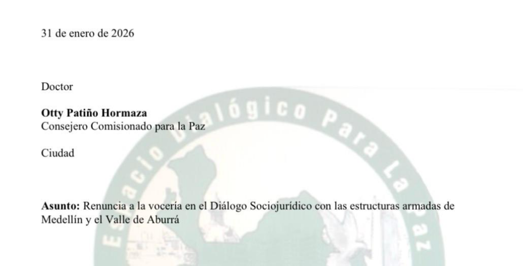 El documento, fechado el 31 de enero de 2026, señala que el proceso instalado en la cárcel La Paz de Itagüí habría enfrentado dificultades relacionadas con la conducción de las conversaciones. Según el escrito, el diálogo se desarrolló sin lineamientos definidos y con falta de asesoramiento técnico, factores que de acuerdo con Ramírez García derivaron en un estancamiento del mecanismo y en una dinámica marcada por la informalidad.