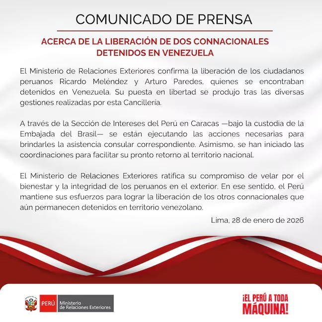 Se trata de Ricardo Meléndez y Arturo Paredes, cuya liberación fue anunciada por el Ministerio de Relaciones Exteriores mediante un comunicado oficial difundido a través de sus canales institucionales.