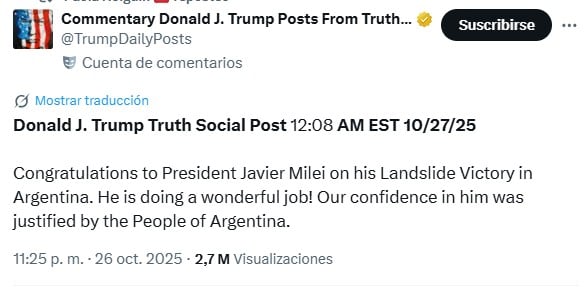 Uno de los primeros en pronunciarse fue el presidente de Estados Unidos, Donald J. Trump, quien a través de su red social Truth Social expresó su respaldo al mandatario argentino: “Felicitaciones al Presidente Javier Milei por su victoria arrolladora en Argentina. Está haciendo un trabajo maravilloso. Nuestra confianza en él fue justificada por el pueblo argentino”.