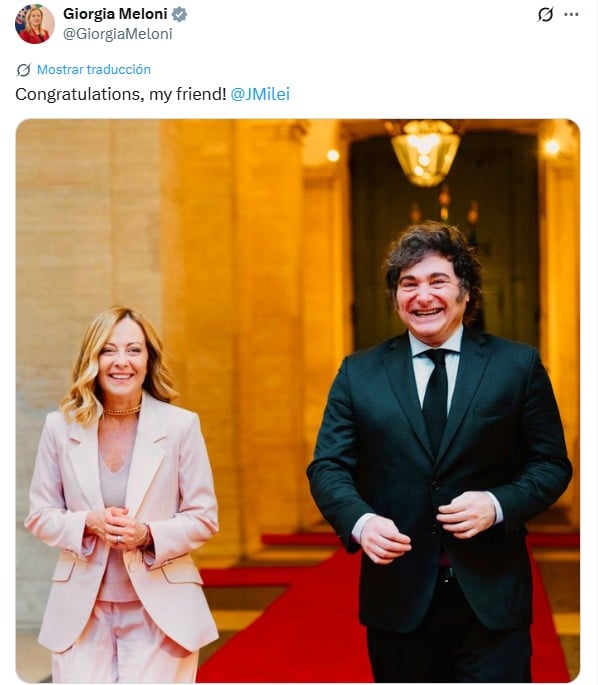 Desde Europa, la primera ministra italiana, Giorgia Meloni, también celebró los resultados con un mensaje directo: “Congratulations, my friend! Javier Milei”, reafirmando la cercanía ideológica entre ambos líderes.