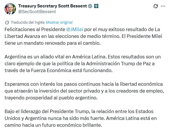 En la misma línea, el secretario del Tesoro de Estados Unidos, Scott Bessent, destacó el resultado y la alianza entre ambos países. En un mensaje publicado en su cuenta de X, afirmó: “Felicitaciones al Presidente Milei por el exitoso resultado de La Libertad Avanza. El Presidente Milei tiene un mandato renovado para el cambio. Argentina es un aliado vital en América Latina”. Además, subrayó que los avances económicos impulsados por el gobierno argentino son una muestra de “la política de la Administración Trump de paz a través de la fuerza económica”.