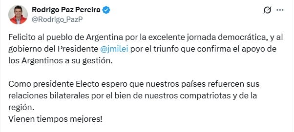 Por su parte, el presidente electo de Bolivia, Rodrigo Paz, envió un mensaje al pueblo argentino por “la excelente jornada democrática” y felicitó a Milei “por el triunfo” obtenido. Aseguró que espera fortalecer los lazos entre ambos países y subrayó que “vienen tiempos mejores” para la región.