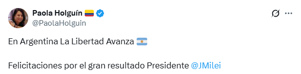 Mientras que su copartidaria, la senadora Paola Holguín, publicó: “En Argentina, La Libertad Avanza. Felicitaciones por el gran resultado Presidente Javer Milei”.