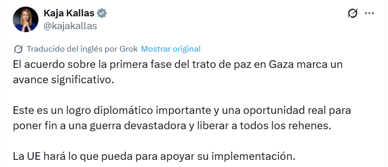Desde Bruselas, la alta representante de Política Exterior de la Unión Europea, Kaja Kallas, calificó el anuncio como “un avance significativo” dentro del proceso de paz. Aseguró que la Unión Europea respaldará la implementación del pacto y consideró que la liberación de los rehenes representa un paso clave hacia la estabilidad en la región.