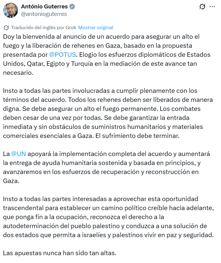El secretario general de la ONU, António Guterres, también saludó el anuncio y reconoció los esfuerzos diplomáticos de Estados Unidos, Egipto, Catar y Turquía. En un comunicado, insistió en la liberación inmediata de los rehenes y en garantizar el ingreso de suministros humanitarios a Gaza. Además, reiteró que las Naciones Unidas participarán en la implementación del acuerdo y en los procesos de reconstrucción.