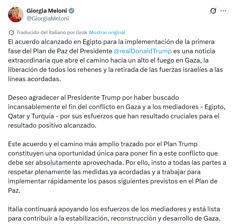 Por su parte, la primera ministra italiana, Giorgia Meloni, agradeció al presidente Trump por su papel en la negociación, señalando que el entendimiento “abre el camino hacia un alto el fuego y la liberación de los rehenes”. También exhortó a las partes a cumplir los compromisos adquiridos.