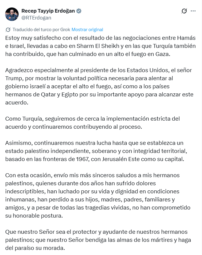 Con estos pronunciamientos, los principales líderes del mundo coincidieron en que el acuerdo entre Israel y Hamás marca un punto de inflexión en la búsqueda de una solución duradera al conflicto, siempre que se garantice su cumplimiento y se mantenga el compromiso diplomático de las partes involucradas.