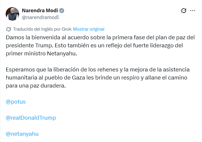 En Asia, el primer ministro indio, Narendra Modi, afirmó que el acuerdo refleja el liderazgo de las autoridades israelíes y expresó su esperanza de que este paso facilite una paz duradera. Desde Pekín, el gobierno chino manifestó su expectativa de que el pacto conduzca a un alto el fuego “permanente e integral” en Gaza.