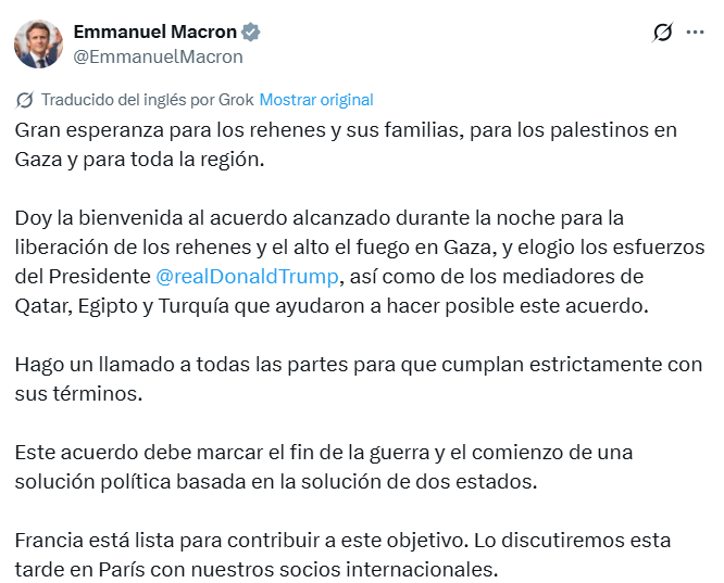 El presidente francés, Emmanuel Macron, manifestó que el pacto representa una oportunidad para retomar el diálogo político en la región, insistiendo en la necesidad de avanzar hacia la solución de dos Estados. Recordó que Francia ha apoyado esta propuesta como la única vía viable para garantizar la convivencia entre israelíes y palestinos. Además, reiteró su disposición a colaborar con los esfuerzos internacionales para la reconstrucción de Gaza y la protección de la población civil.
