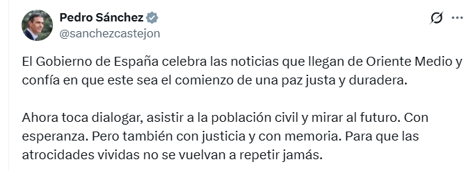 Desde España, el presidente del Gobierno, Pedro Sánchez, calificó el acuerdo como “una señal esperanzadora después de años de violencia”. En un comunicado oficial, señaló que el alto el fuego y la liberación de los rehenes deben ir acompañados de compromisos firmes que aseguren la estabilidad en la región. Sánchez reafirmó el respaldo de España a las iniciativas multilaterales que promuevan la paz, en coordinación con la Unión Europea y las Naciones Unidas.