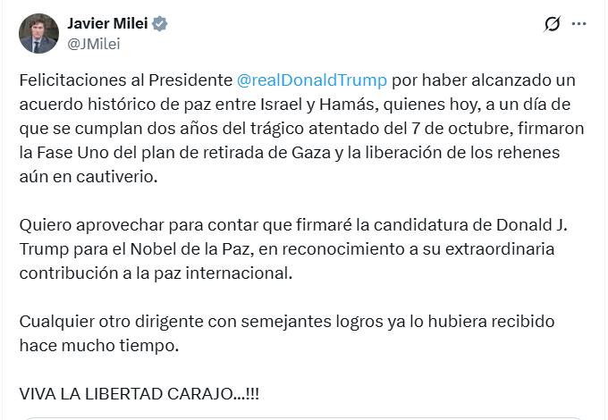 En América del Sur, el presidente argentino, Javier Milei, celebró el anuncio y lo calificó como “una contribución histórica a la paz internacional”. A través de un comunicado, afirmó que Argentina “acompaña los esfuerzos de la comunidad internacional por alcanzar la estabilidad en Medio Oriente” y reiteró su respaldo a las iniciativas que promuevan el respeto a los derechos humanos y el fin de la violencia.