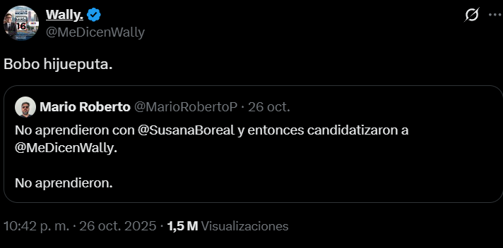 El debate se desató tras su respuesta a un comentario en X (antes Twitter), donde el usuario @MarioRobertoP escribió: “No aprendieron con Susana Boreal y entonces candidatizaron a Me Dicen Wally”, señalando además que el influencer era un “mercenario digital”.