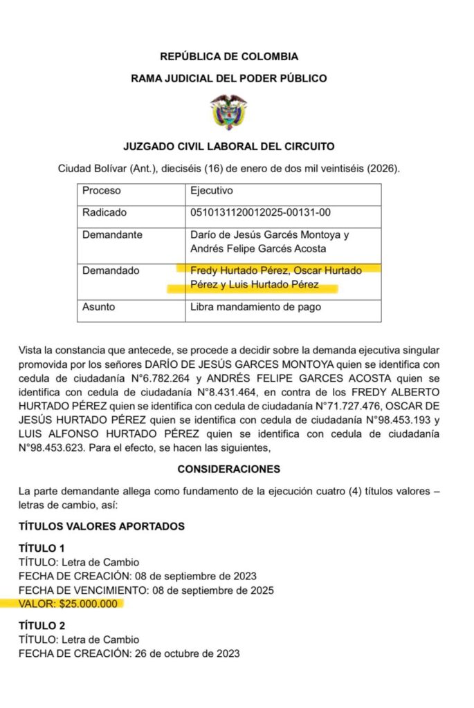 Un mandamiento de pago fue librado por el Juzgado Civil Laboral del Circuito de Ciudad Bolívar, Antioquia, dentro de un proceso ejecutivo radicado el 16 de enero de 2026, en el que figuran como demandados Fredy Hurtado Pérez, Óscar Hurtado Pérez y Luis Hurtado Pérez. La actuación judicial se origina en una demanda presentada por Darío de Jesús Garcés Montoya y Andrés Felipe Garcés Acosta, con fundamento en varios títulos valores, entre ellos letras de cambio.