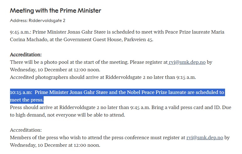 Según informó el Gobierno de Noruega, la comparecencia se realizará el jueves 11 de diciembre a las 9:15 GMT, equivalente a las 4:15 a.m. en Colombia. El encuentro tendrá lugar después de una reunión programada entre Machado y el primer ministro noruego, Jonas Gahr Støre.